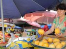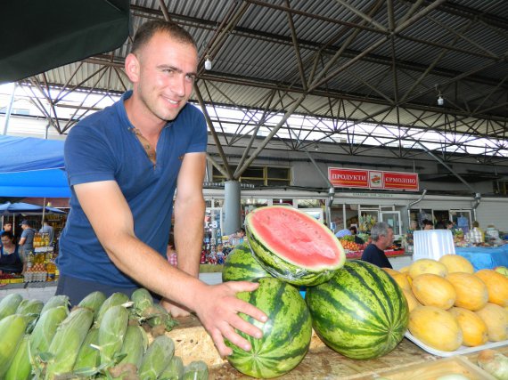"Завозят из Херсонщины. Там их выращивают под пленкой. Чтобы попробовать впервые в этом сезоне, люди покупают половину арбуза. Дыни тоже уже завозим. Сладкий сорт "Раймонд" стоит 40 гривен за килограмм. Плоды небольшие. Одна дыня весит где-то на 500 граммов до килограмма. Есть дешевле сорт. Продаем по 30 гривен, как арбузы", - говорит Gazeta.ua продавец Вусал Мамедов.