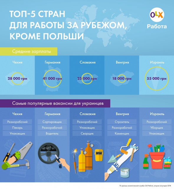 Ощутимо меньше предлагали рабочим в Венгрии - 18 тыс. грн. В пятерку самых популярных стран, куда ехали работать украинцы, вошел Израиль. Там работникам платили 55 тыс. грн. Искали разнорабочих, уборщиков и упаковщиков.
