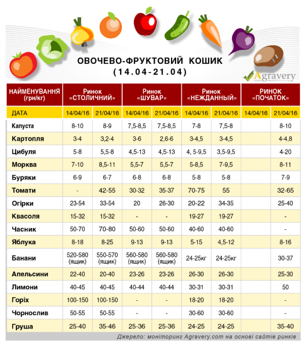 На этой неделе цены на всех рынках подорожали томаты. Исключение - рынок "Нежданный" в Херсонской области. Так, по состоянию на 21 апреля стоимость тепличных помидоров на рынке "Столичный" в Киеве зафиксировалась в диапазоне 42-55 грн / кг, тогда чем 7 апреля цены стартовали от 34 грн / кг. На львовском "Шуваре" цены с 30-32 грн / кг добрались значений в диапазоне 35-37 грн / кг. А вот рынок "Нежданный", предлагает данный овощ по цене 55 грн / кг против 70-75 грн / кг неделей ранее. На гривну-две выросли цены на морковь и яблоки.