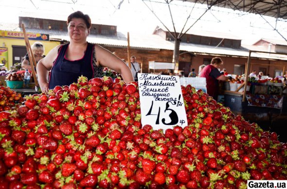 47-летняя Валентина Макуха на соседнем ряду продает черешню, клубнику. На ценниках указано: "Черешня "Изюминка". Сладющая ","Клубника "Мальвина". Обалденно вкусная!"