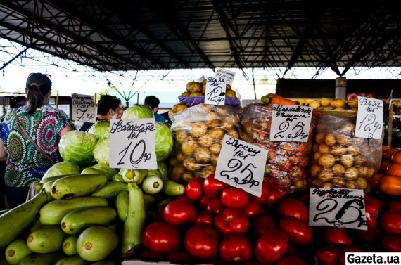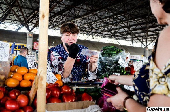 На Центральном рынке Полтавы продавец овощей 65-летняя Татьяна Павлюченко поправляет ценник на мешке с молодой мелкой картошкой. На нем черным маркером от руки написано - "Картошечка для неленивых". На другом - "Картошечка для работящих рук". Килограмм стоит 10 грн.