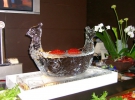 "Ледяные фонтаны заказывают для подачи вина и шампанского. В блюдах изо льда подают морепродукты, - говорит Шевчук. - Подача блюд в ледяных композициях оригинальна, потому что лед еще подсвечивается. Стол выглядит неповторимо даже при очень скромной сервировке. Жена одного футболиста осенью праздновала день рождения. Мартини и шампанское гостям подавали в конусообразных бокалах со льда. Такие даже в жару не растают в течение часа".