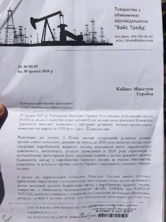 "Предлагаем провести переговоры с нами, как потенциальным инвестором реализации проекта строительства завода по производству ядерного топлива", - резюмируется в документе.
