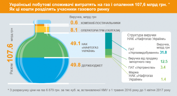 Новая, цена 6,88 грн за куб. м газа для бытовых потребителей принесет наибольшую выгоду госбюджету и госхолдингу "Нафтогаз Украины". Они почти поровну разделят между собой 92% доходов, которые оценивают более чем в 107 млрд грн в год. Остальные 8% оставлены частным газораспределительным предприятиям и компаниям-поставщикам.