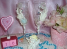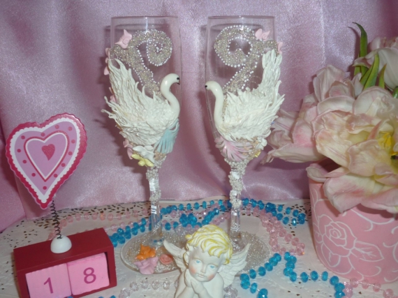 "Раньше пользовалась службами доставки, но когда два бокала курьеры разбили и я подставила новобрачных, потому что не успела изготовить другие, начала свои изделия привозить сама. На один бокал может идти от 2 часов до суток. Когда идеи приходят на парах, зарисовываю их в конспектах, а дома экспериментирую. Иногда минимальное количество декора только способствует созданию оригинальной композиции. Летом фужеры можно просто украсить живыми цветами - оплести венчиком вокруг ножки бокала - это уже будет выглядеть непревзойденно. Можно просто привязать к бокалу игрушку или несколько искусственных бутоньерок. Этот вариант самый простой. Его невесты могут сделать сами", - рассказала Орищин.