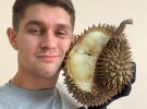 Дуриан - известный своим противным запахом, похожим на серу, когда его разрезать. Поэтому мало любителей. Я его "понял", когда решился попробовать второй раз. Постепенно почувствовался привкус кофе и заварного крема. А кожуру сразу лучше выбросить.