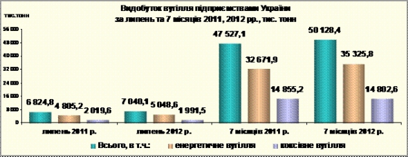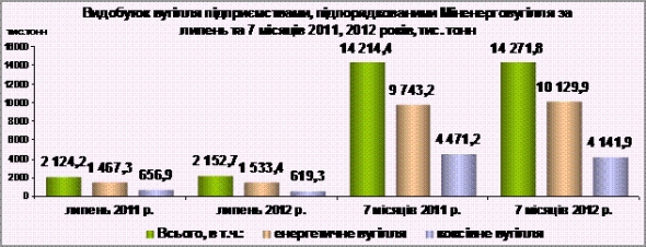 По июле 2012 угледобывающими предприятиями Украины добыто угля на 215,3 тыс. тонн, или на 3,2% по сравнению с июлем 2011 года. При этом добыча энергетического угля увеличилась на 243,4 тыс. тонн, или на 5,1%, коксующегося - уменьшился на 28,1 тыс. тонн, или на 1,4%.