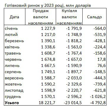 "В декабре украинцы купили рекордный за 11 лет объем валюты (в ноябре 2012 года - $1,523 млрд). Всего с начала 2023 года украинцы продали $18,222 млрд и купили $23,015 млрд. Чистая покупка валюты составила $4,793 млрд", - сказано в сообщении.