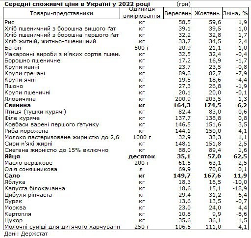 По данным статистического ведомства, по сравнению с сентябрем текущего года яйца подорожали на 62,5% до 57 грн за десяток, сало на 11,9% до 167,6 грн за кг, а свинина на 6,2% до 174,5 грн за кг.