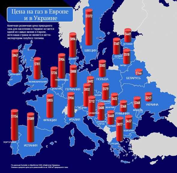Согласно инфографики, размещенной на сайте ведомства, украинцы платят 257 долл. за тыс. куб. м газа. Самые высокие цены в Швеции. Там голубое топливо обходится в 1372 долл. за тыс. "кубов", Португалии - 1154 долл., Испании - 1089 долл.