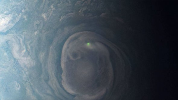 Зонд NASA сделал уникальный снимок зеленой вспышки от удара молнии внутри закрученного вихря близ северного полюса Юпитера.