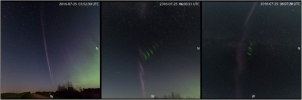 Канадский астрофотограф-любитель Нотани Бурасса в июле 2016-го снимал необычное полярное сияние. Съемка длилась 19 мин. В этот момент свечение фиксировали наземные камеры All-Sky Imagers, фотометры Meridian Scanning Photometers и аппарат Swarm. С земли устройства зафиксировали тонкую дугу фиолетово-белого цвета и неустойчивую зеленую структуру.