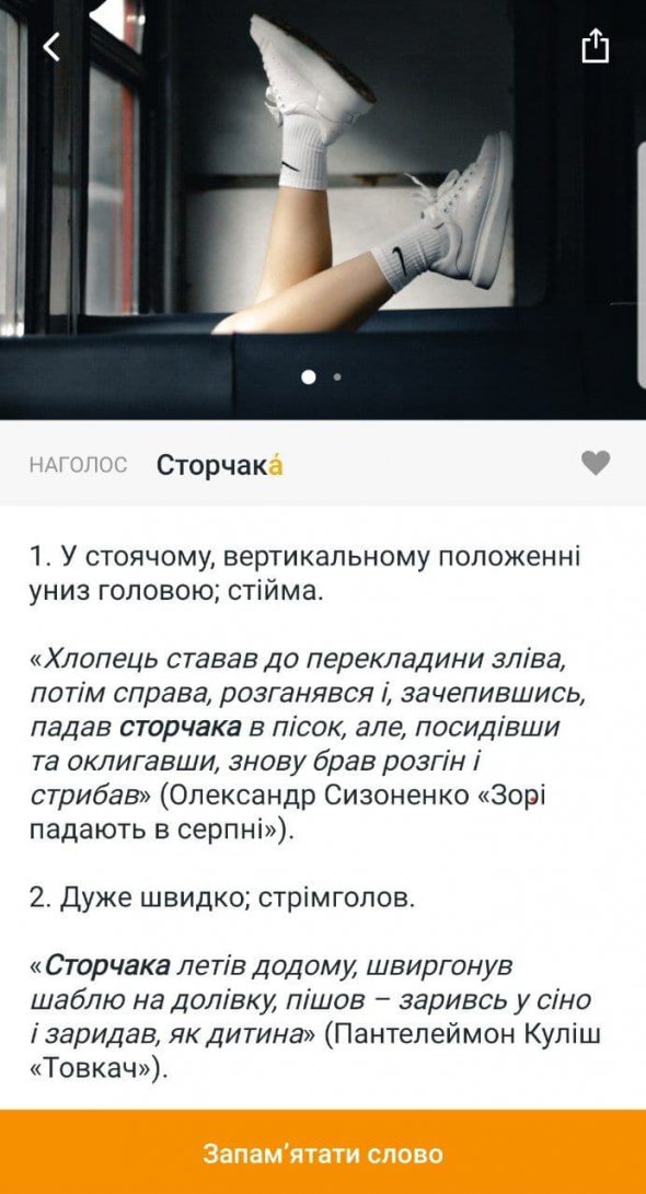 Когда нажмете на слово, то увидите картинку, его иллюстрирует, ударение, определения и примеры. Не забудьте нажать "Запомнить слово". После запоминания начисляются песчинки времени. Их можно потратить на изучение истории Украины в нашей другой мобильной программе - "Магазин".