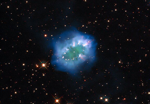 Космическое "ожерелье с бриллиантами" появилось в результате взаимодействия двух похожих на Солнце звезд, сообщается на сайте обсерватории. Туманность находится в созвездии Стрела.
