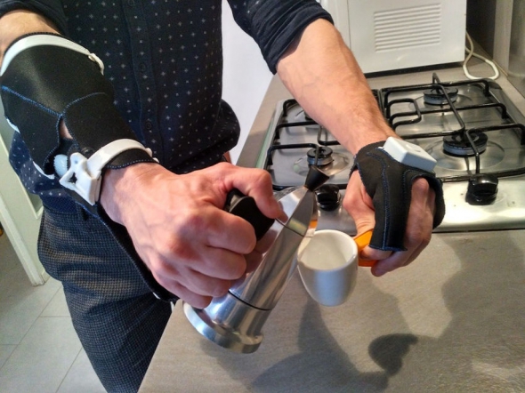 Устройство дает возможность двигать симметрично двумя руками или использовать работающую руку как джойстик для управления другой рукой. На здоровую руку надевают перчатку с сенсором, который считывает движения указательного пальца - и когда он сгибается, посылает Bluetooth-сигнал рукаву на неработающей руке.