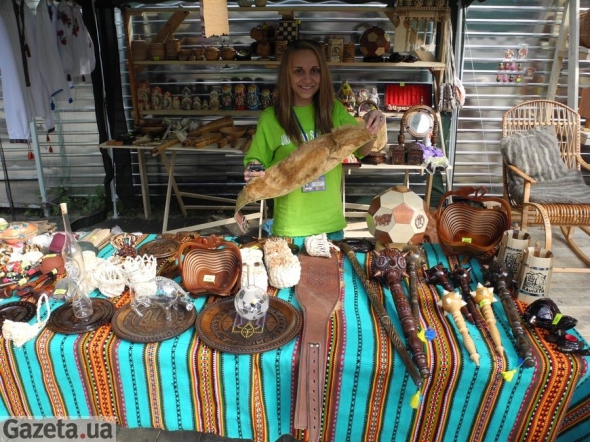 "Пока никто ничего не покупал. Но интересовались. Больше вышиванками и этими поясами, - продавец 18-летняя Анастасия Бреннер показывает кожаный пояс с мехом. - Это из собаки, хорошо греет. Стоит 300 грн. Еще мяч всех заинтересовал. Он сверху деревянный, размером с настоящий. А внутри металлическая фляга. Можно что-то наливать".
