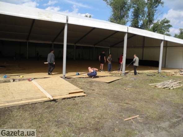 Рядом с ними в огромном шатре строители кладут деревянный пол. Пройти невозможно, повсюду разбросаны провода и доски.
