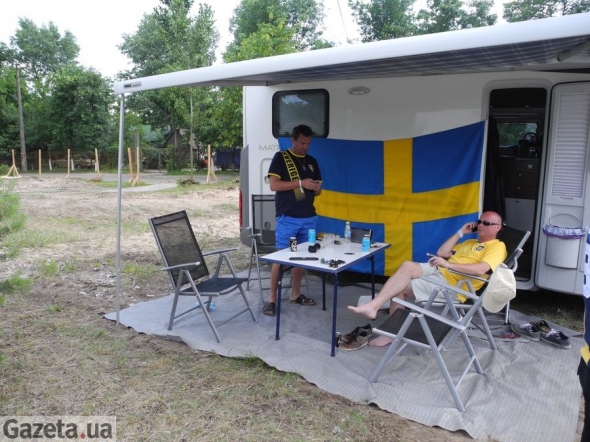 "Я знал, как будет по-украински "чирз", но забыл. А, точно, "будьмо!". Также знаю "да". Это, кажется, русский язык, - вмешивается в разговор. - Мы пробудем здесь семь дней. Заплатили за место в кемпинге около 6000 гривен в неделю за четырех. Я был на чемпионате Европы в Германии. Это нормальная цена. Но условия там были намного лучше. Это на самом деле не кемпинг. Вы знаете, что такое кемпинг? Поезжайте в Швецию. Там мы бассейны, спортивные площадки, все покрыто зеленой травой. А тут грязь".