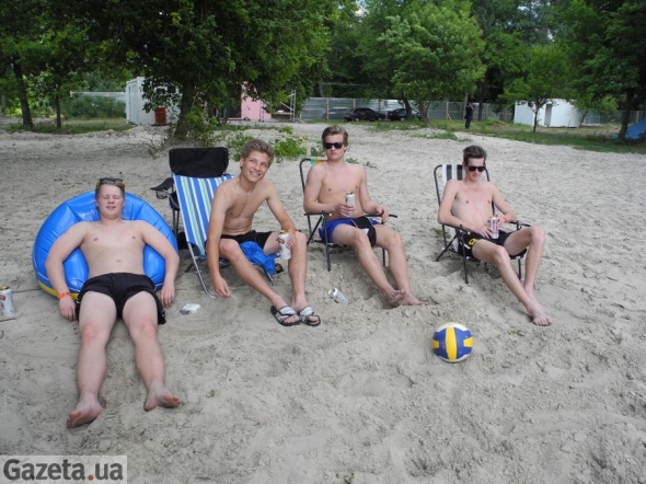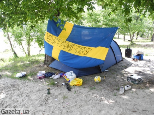 "Я был на "Евро" в Австрии, и там постоянно шел дождь. Поэтому здесь мне нравится больше, - говорит 19-летний Ола Рапейс. Вместе с тремя друзьями-сверстниками он лежит в раскладном шезлонге на пляже. Загорает. Только искупался в Днепре. Недалеко поставлена палатка со шведским флагом. Стоят рюкзаки и обувь. В Украину молодые люди добрались на авто. - Машину оставили на парковке. Она единственная на этой парковке. Когда были в Сарнах в Ровенской области, ели суп и пили Львовское пиво. У вас очень низкие цены. У нас поллитра пива стоит на ваши деньги 50 гривен, здесь можно купить за 5-10 гривен".