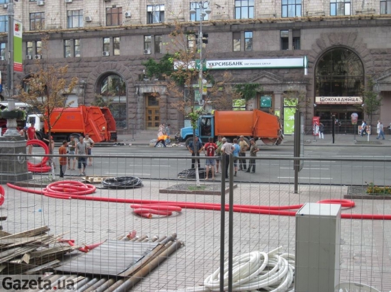 "В понедельник должны пустить транспорт по улице. Сейчас убираем ее, снимаем плакаты. Часть рабочих демонтируют ВИПовську площадку, и отключают коммуникации. Остаются туалеты, забор и клетка Фунтика. Затем проведут косметический ремонт улицы, обновят газоны, столбы и скамейки, ведь их активно вытоптали", - рассказал один из сотрудников Юрий.