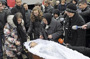 – Ану подивимося, чи є в нього родимка на грудях, – підходить до труни Ярослава Мазурка його мати Галина Михайлівна, 63 роки. Кладе руки на груди небіжчику, намагається розстебнути сорочку.