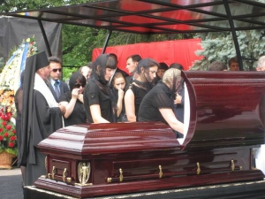 Із велетенських динаміків звучить класична музика. Вінки та букети тримають понад 300 держслужбовців, переважно жінки. Їх у робочий день зобов'язали йти на похорон. Навпроти трибуни - взвод курсантів військового училища. Дочки, дружина, мати покійного сідають біля могили. Члени уряду й нардепи стають навпроти. Труна з червоного дерева - на чорному п'єдесталі в центрі.