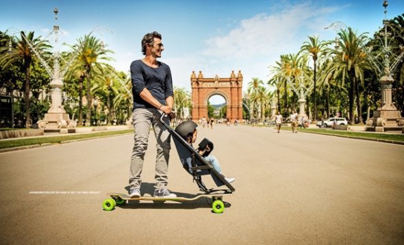 Такая гибридная коляска-доска доступна только в странах ЕвроСоюза, а остальным остается лишь мечтать. Коляска выдерживает вес ребенка до 15 кг, а на ручке есть тормоз.