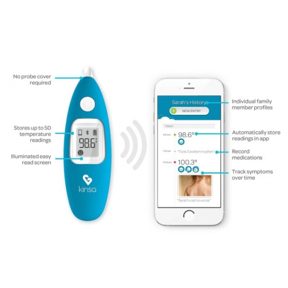 Специальное приложение, Kinsa app, доступное на iPhone и Android, сопрягается с цифровым термометром, чтобы фиксировать изменения температуры ребенка. Также можно фиксировать часы приема медикаментов, добавлять фото и другую информацию с пометкой времени.