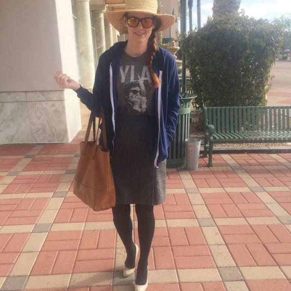 Выбор пал на футболку с Бобом Диланом, серую юбку и плотные колготы. Правда, когда Саммер решила, что это сочетание завершено и его можно будет смело повторять после эксперимента, Рок уверенно добавил туфли на каблуке и синюю толстовку. Новаторы, они такие.