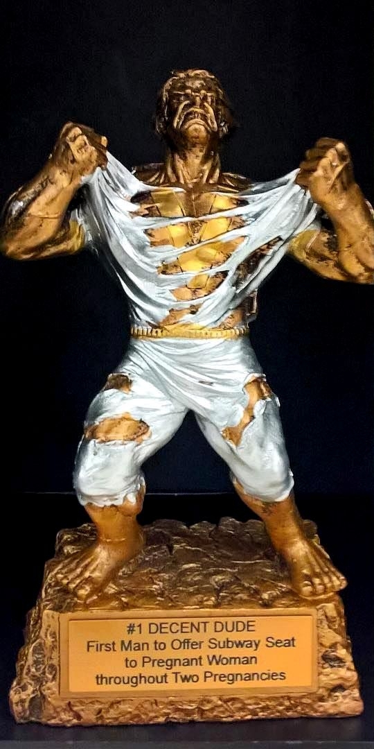 38-летняя Ивонн Лин, дизайнер из Нью-Йорка, сделала статуэтку в награду мужчине, который уступит ей беременной место в метро. Герой нашёлся, когда женщина была беременна вторым ребёнком на восьмом месяце. Во время первой беременности ей уступали место в метро только женщины.