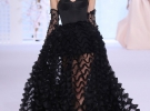Имеются такие модели: песочные часы, комплекты с пиджаками и юбками, корсеты, прозрачные силуэты, платья-накидки и модели-халаты. Фишкой стали объемные болеро из перьев.