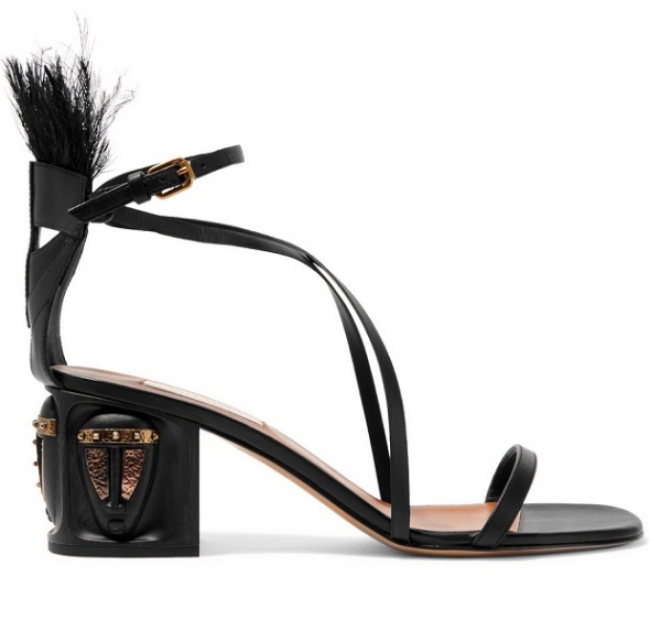 Африка задает настроение в этом сезоне. С приходом настоящей жары ее мотивы выглядят особенно актуально. Раскрыть дикую атмосферу больше всего получилось у дизайнеров бренда Valentino. Они украсили обувь изображением африканской маски и черными перьями страуса Эму. Сандалии на невысоком устойчивом каблуке.