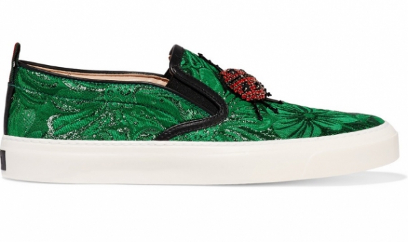 Модный тренд обувь потерял свое спортивное прошлое. Дизайнер Gucci создал слипоны с изумрудной парчи, которая переливается. Он украсил их объемной божьей коровкой. Носить обувь автор рекомендует с короткими шортами или обрезанными джинсами с открытыми лодыжками.