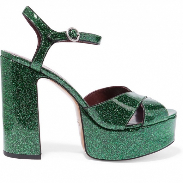 Босоножки на массивных каблуках выглядят ярко. Дизайнер Марк Джейкобс создал модель для повседневного и вечернего комфорта. Он сшил босоножки из лаковой кожи, которая усыпана блестками.