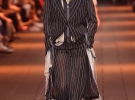 Модели вышли на подиум в длинных однотонных рубашках и свитерах. Для придания контраста их дополнили кожаными ботфортами-чулками на толстой белой платформе с фирменными принтами.