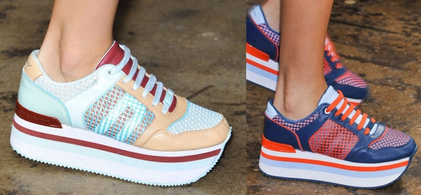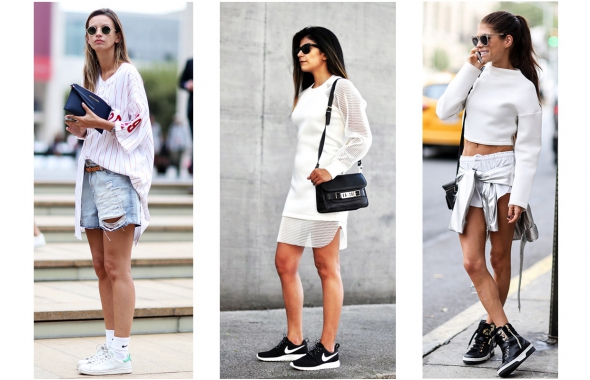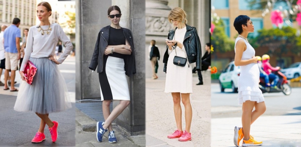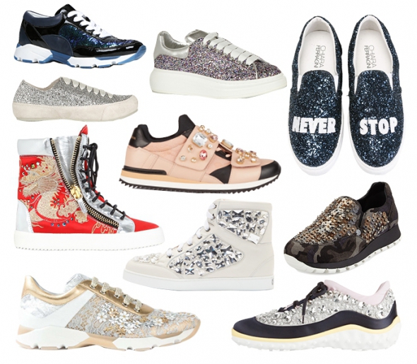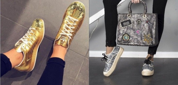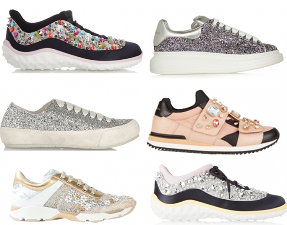 Гламурный вариант. В этих моделях от спортивной обуви осталась только форма. Для нового сезона дизайнеры предложили модницам варианты с кружевом и блестками. Как правило, обувь однотонное. Хотя некоторые дизайнеры все же сочетают два-три цвета. Такие кроссовки идеально дополнят образ в стиле спорт-шик.