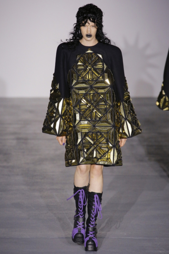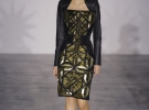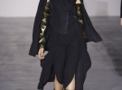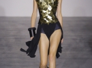 Показ условно разделился на две части. Сначала модели словно гладиаторы под звуки барабанов появились в громоздких черных нарядах с золотыми аппликациями. Впоследствии воинственная тема меняется ненавязчивыми формами кремовых и ярких оттенков. Черные и светлые полосы, идущие из одного центра, воплощают солнечные лучи, напоминающие предметы для гипноза.
