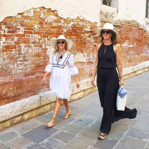 На снимке Ава обнимает Риз, обе улыбаются. Одета в белую вышиванку с рукавами три четверти. Модель украшена черно-красным узором.