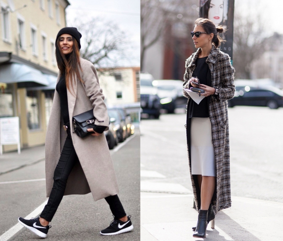 Сочетать пальто средней длины можно с любым стилем. Самым популярным вариантом является образ кэжуал с джинсами, свитером и кроссовками. Для офисного варианта выберите классические брюки и туфли-лодочки.