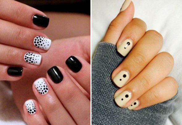 Изменить форму ногтя поможет маникюр с точками, который на коротких ногтях смотрится очень заманчиво.