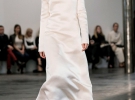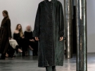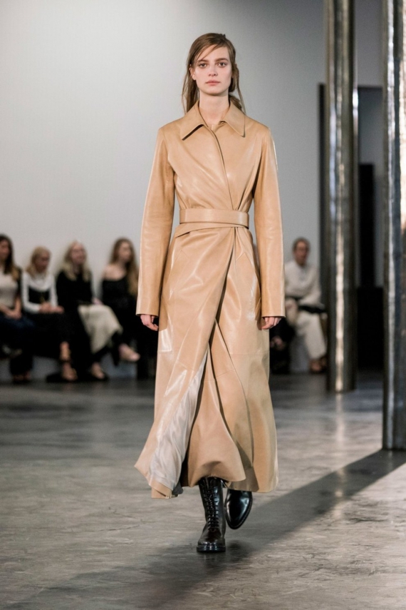 На подиуме представили объемные тренчи из искусственной кожи и пальто из двустороннего кашемира. Силуэты подчеркнули высокими поясами на талии. Рубашки классического кроя объединили с прямым юбками макси с посадкой на бедрах. Образы дополнили высокими ботинками на шнуровке с заостренными носками. Такой прием добавил контрастности.