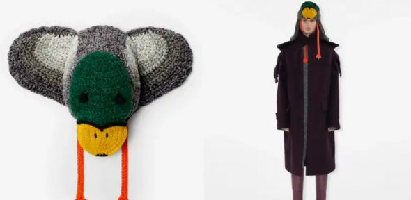 Британский модный дом Burberry создал необычную шапку. Дизайнеры связали головной убор в виде утки, у которой вместо козырька - клюв, а вместо завязок - лапы.