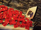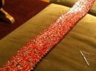 Когда Эмили собрала необходимое количество, рассортировала конфеты по цветам. Далее разгладила поверхности утюгом, составила в ленты и создала цепь. Сшила с помощью эластичных нитей.