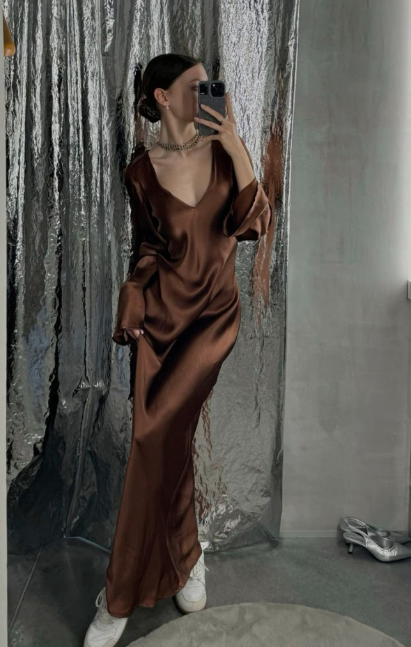 Присмотритесь к главному цвету 2025 года. Шоколадно-коричневый оттенок придаст образу изящной красоты и сдержанной роскоши. Вырезы на бедрах придают пикантности и романтичности. Дополняйте образ минималистичными золотыми украшениями и легкими локонами или непринужденным пучком.