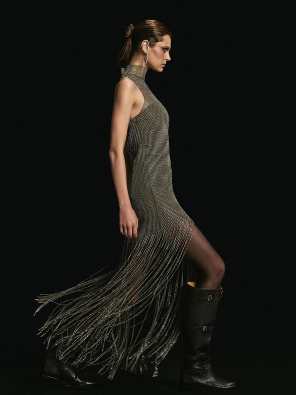 Бахрома придает образу подвижности и воздушности. Как элемент бохо стиля она может полноценно заменить низ платья или добавить акцентов на рукавах. Относительно цветов - присмотритесь к коричневому, черному, изумрудному или хаки.