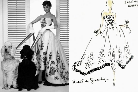 Именно с этого наряда началось знакомство Юбера де Живанши и Одри Хепберн. В далеком 1954 году молодая актриса выбирала образы для комедии "Сабрина" и так попала в ателье к дизайнеру. В тандеме они создали белое платье-бюстье с пышной юбкой, украшенной цветочной вышивкой. Оно уже несколько десятилетий входит в списки самых востребованных силуэтов в невест.