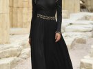 Вечерний блок коллекции был полон длинных силуэтов с элементами мелкого декора и золотых элементов. Талию дизайнер подчеркнул широкими поясами, украшенными камнями.