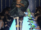 Сама же певица-дизайнер в завершение шоу появилась на подиуме в длинном пальто свежего желто-зеленого оттенка. Одежду, которая больше похожа на банный халат, соединила с принтованной футболкой и туфлями на каблуках, сделанных на спортивный манер.
