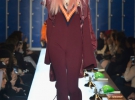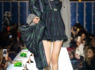 Шоу открыла модель с обнаженной грудью, которую едва прикрывал длинный пуховик. Верхняя одежда покрыта клетчатым принтом. Образ дополнен большим количеством аксессуаров, зелеными сапогами и книгой, имитирующей клатч.