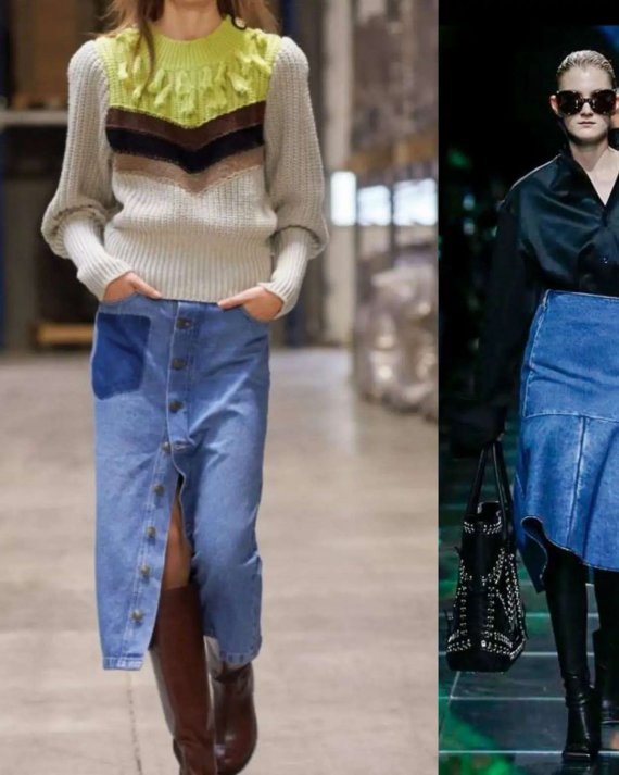 Джинсовые юбки как длинные так и короткие надо носить в сезоне с вязаным кардиганом, заимствованным из "бабушкиного" гардероба.
